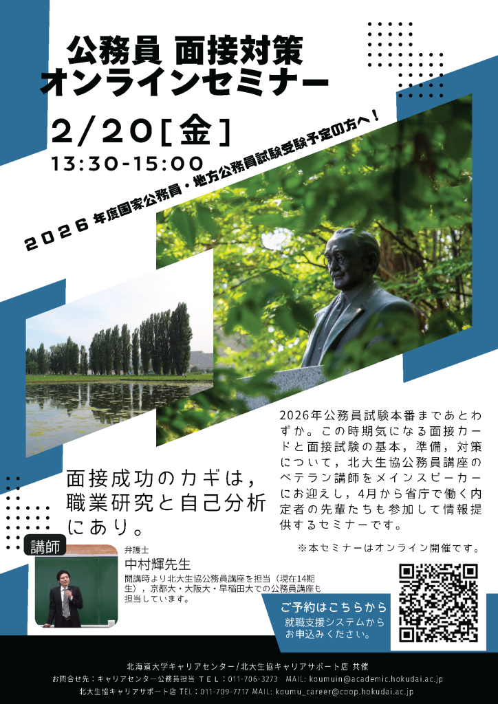 これから対策を始めたい方はもちろん、 春の国家・地方公務員試験を受験予定で、 面接対策に不安を感じている方にもおすすめのセミナーです。