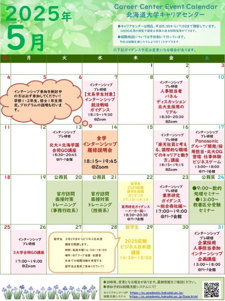 お知らせ 2025/05/01 【5月】キャリアセンター主催・共催イベントカレンダー 2025年5月度のイベントカレンダーです。 詳細や参加予約は【就職支援システム】等で行っておりますので、そちらをご確認ください。