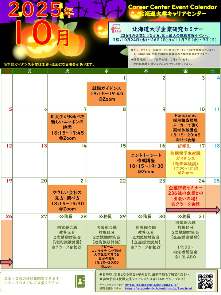 お知らせ 2025/09/30 【10月】キャリアセンター主催・共催イベントカレンダー 2025年10月のイベントカレンダーです。詳細や参加方法は「就職支援システム」等でおこなっておりますので、そちらをご確認ください。