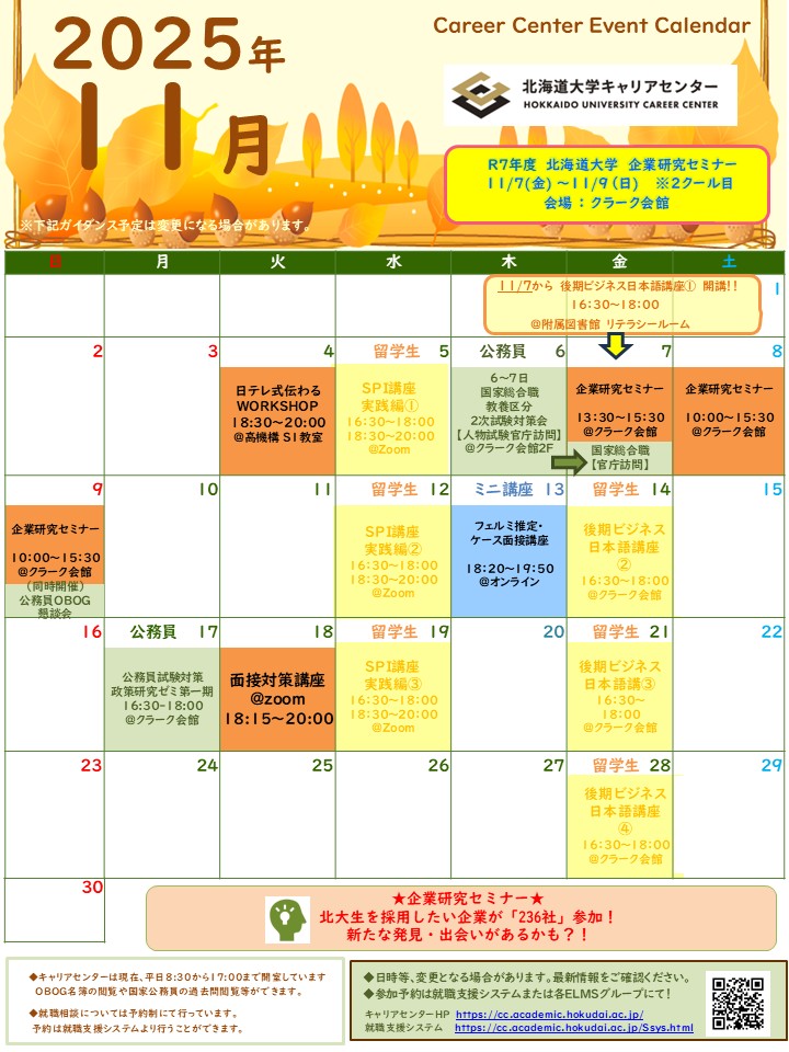 お知らせ 2025/10/31 【11月】キャリアセンター主催・共催イベントカレンダー 2025年11月のイベントカレンダーです。詳細や参加方法は「就職支援システム」等でおこなっておりますので、そちらをご確認ください。