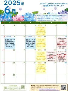 お知らせ 2025/06/04 【6月】キャリアセンター主催・共催イベントカレンダー | 北海道大学キャリアセンター 2025年6月度のイベントカレンダーです。 詳細や参加予約は【就職支援システム】等で行っておりますので、そちらをご確認ください。