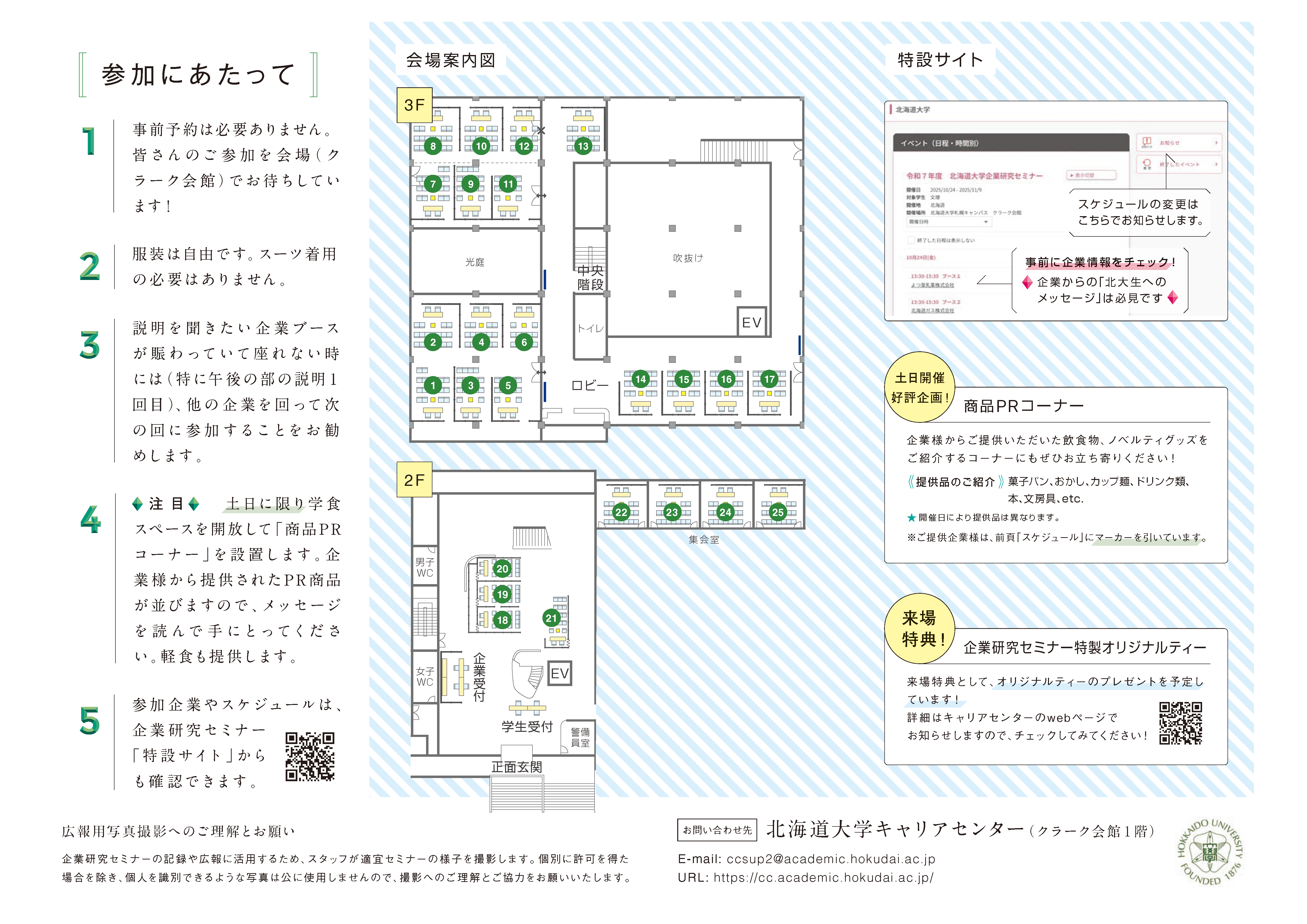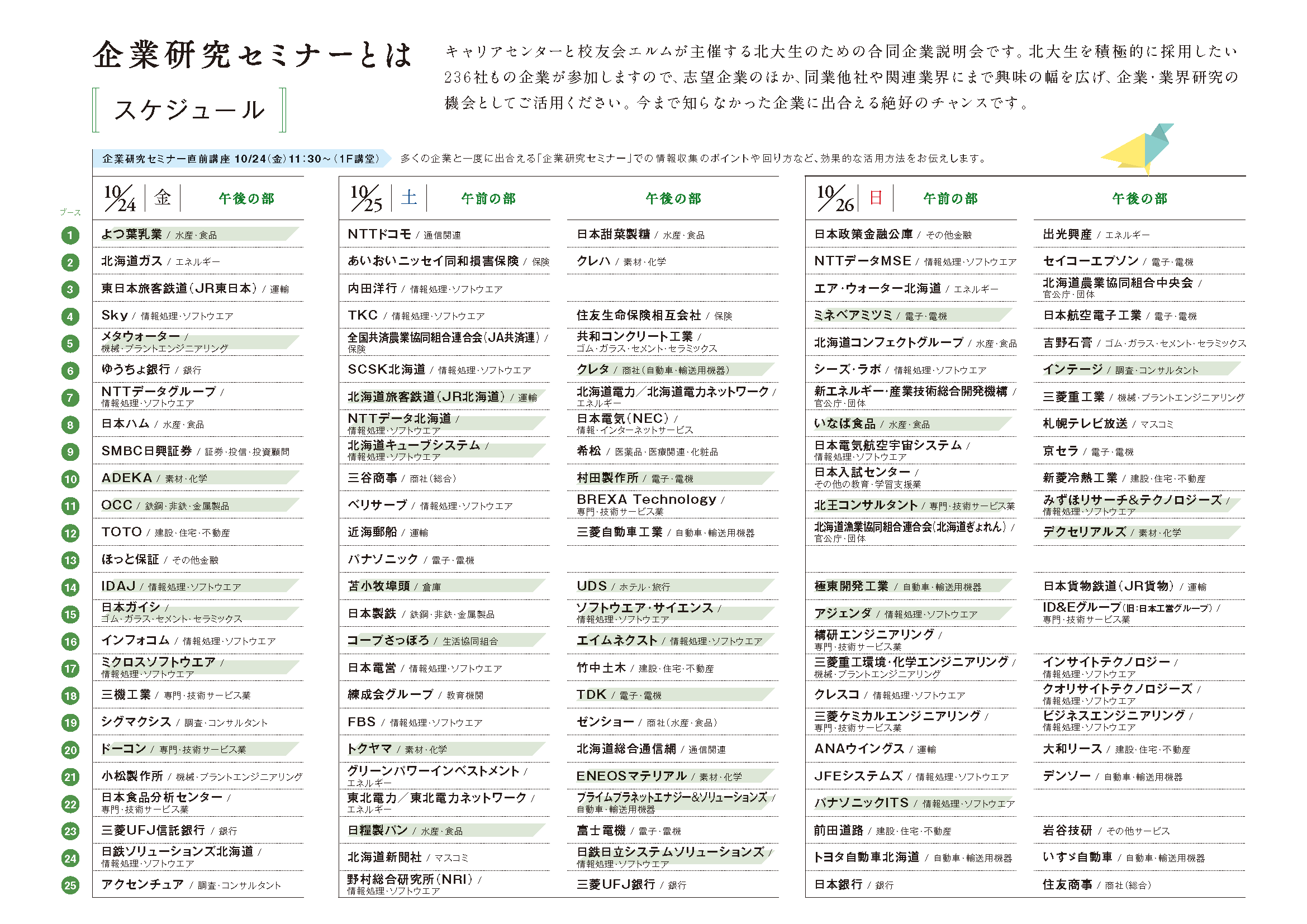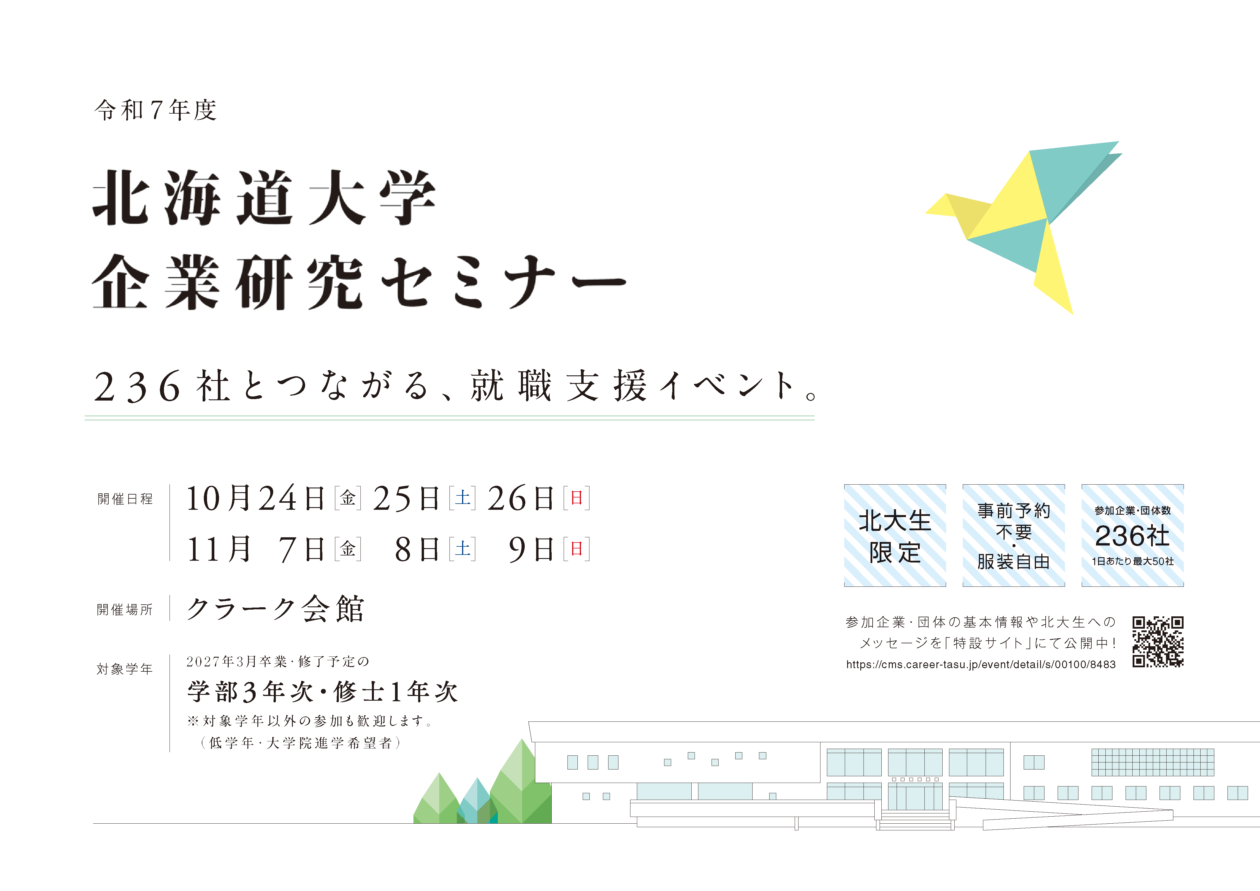 ★北海道大学最大の就職支援イベント「企業研究セミナー」を10月24日(金)から26日(日)、11月7日(金)から9日(日)までの計6日間で開催します。